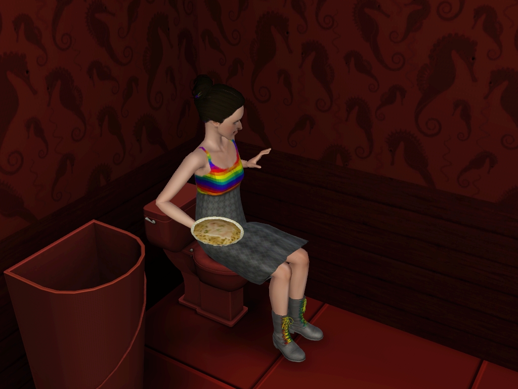 Sweetie, why are you holding your food and using the toilet at the same time.